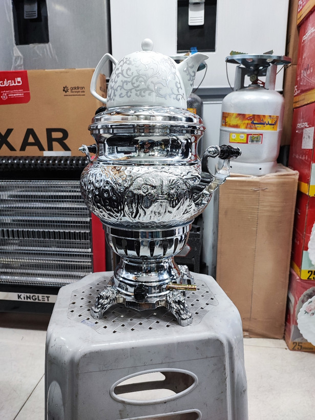 سماور گازی ۶ لیتری با قوری قلم کاری مدل عدسی سه کاره