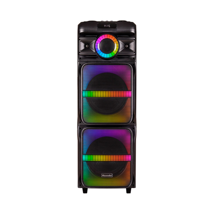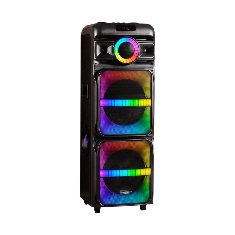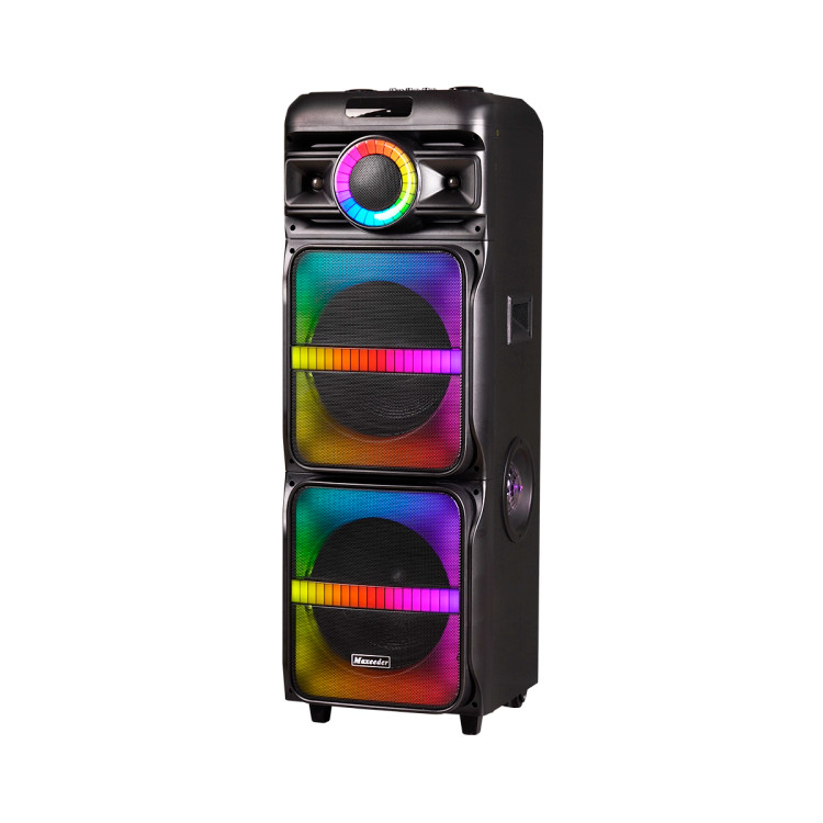 دارای چرخ برای حمل آسان-قابلیت TWS-قابلیت اولویت میکروفون (Microphone priority)-کارائوکه -دارای کلید سه حالته (باتری، خاموش، برق شهر)-دارای رقص نور چرخشی RGB دور سابها 2 نور جانبی Light Ball- دارای ورودی 12 ولت 7 آمپر به صورت مجزا-ورودی گیتار برقی-دارای دو ساب 12 اینچ میدرنج و تیوتر-قابل حمل-نمایش حالت باتری-دارای بیس و تریبل و اکولایزر-دارای اکو و ولوم میکروفون-2 پورت USB