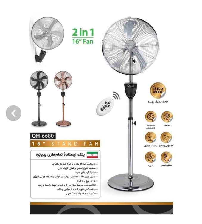 5 پره, دارای چهار حالت, دارای سه سرعت متفاوت, نمایشگر دمای محیط