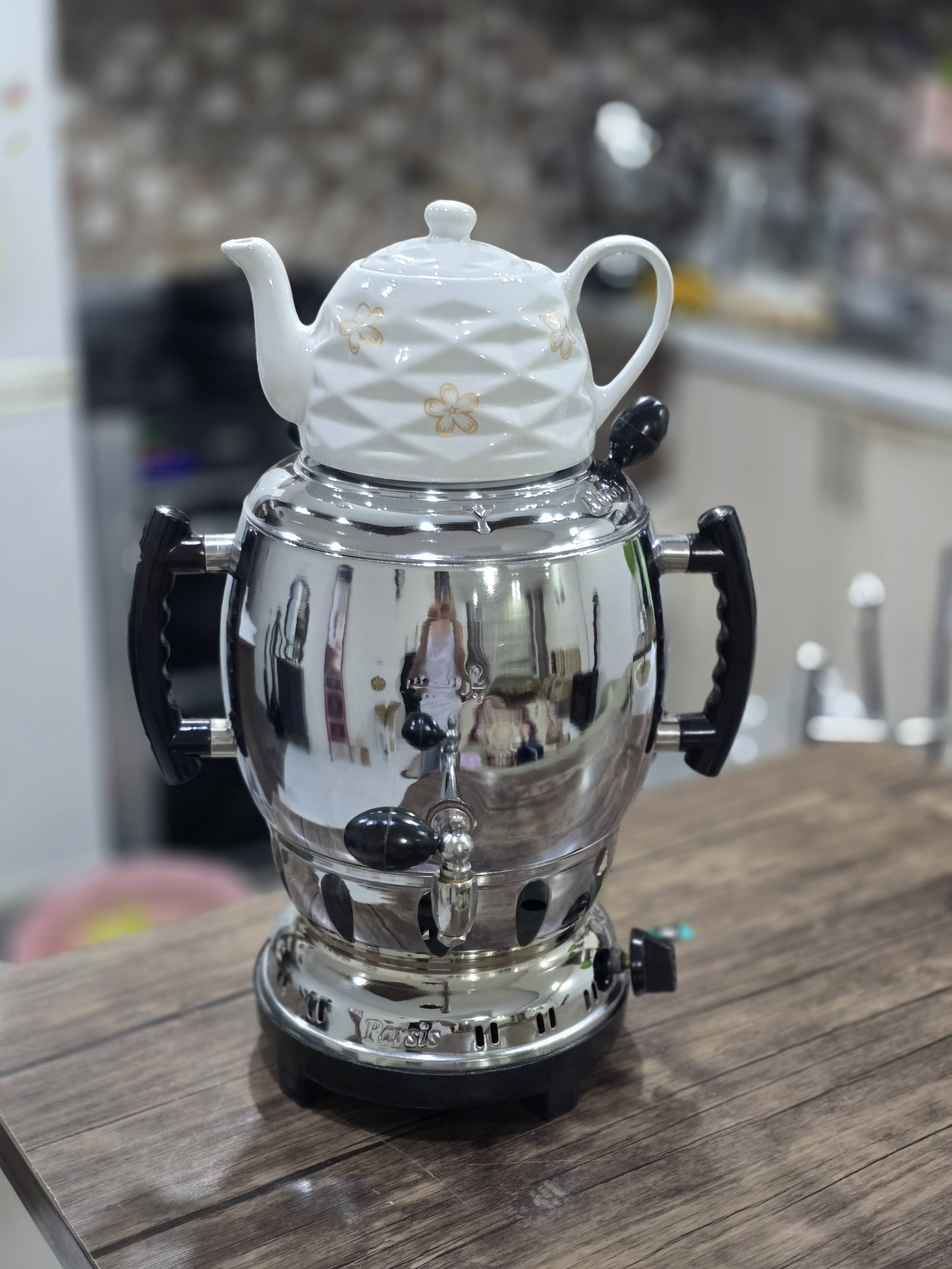 سماور گازی ۶ لیتری مدل عدسی سه کاره قلم کاری با قوری